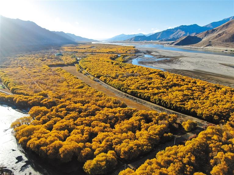 圖為初冬時節(jié),落日余暉下的雅魯藏布江河谷防護林。記者 丹增平措 武沛濤 攝