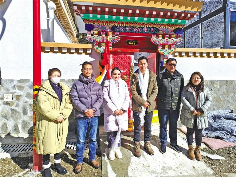 圖為搬遷群眾達(dá)瓦次仁一家與工作人員在新家門前合影留念。記者 武沛濤 攝