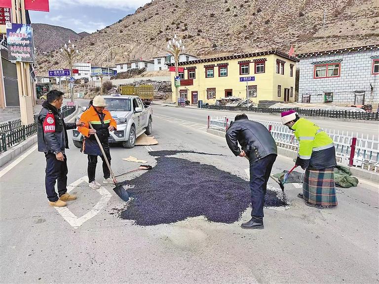 圖為洛隆縣組織公路養(yǎng)護段開展路面修復工作。記者 貢秋曲措 攝