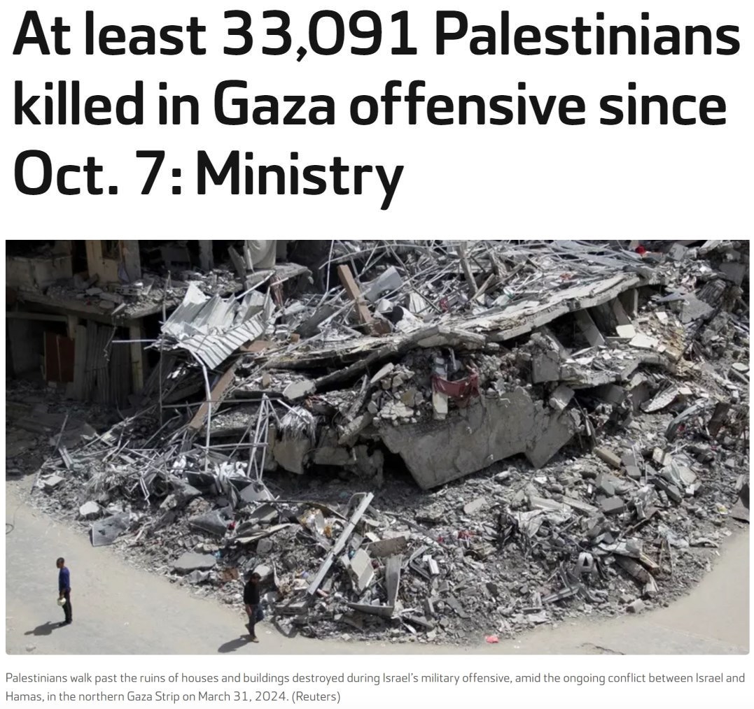 根據加沙衛(wèi)生部門當地時間5日提供的數據,以色列在加沙地帶的軍事行動已導致超過3.3萬人死亡,超過7.5萬人受傷,其中大部分是巴勒斯坦婦女和兒童。