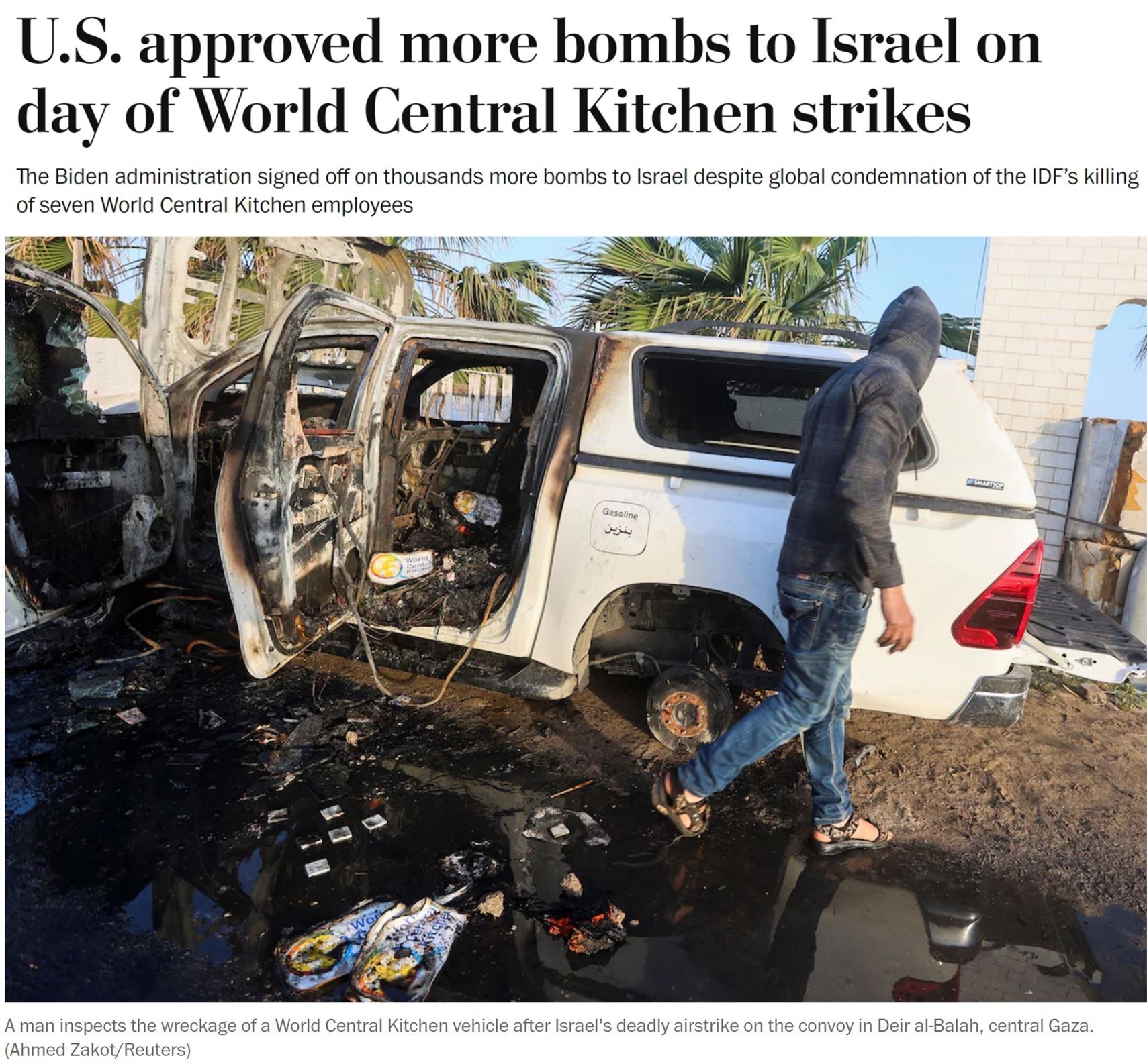 據美媒報道,就在以軍襲擊國際慈善組織的同一天,美國批準再向以色列提供數千枚炸彈。