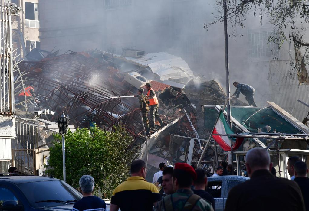 4月1日,在敘利亞首都大馬士革,救援人員在伊朗駐敘使館遭襲現(xiàn)場(chǎng)搜救。新華社發(fā)(阿瑪爾攝)