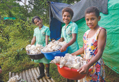 中國政府面向斐濟(jì)等太平洋島國推廣菌草技術(shù),推動當(dāng)?shù)亟?jīng)濟(jì)發(fā)展,助力當(dāng)?shù)孛裆纳?。圖為在斐濟(jì)奈塔希里乳業(yè)婦女組織菌草技術(shù)示范點(diǎn),孩子們正在幫忙采菇。