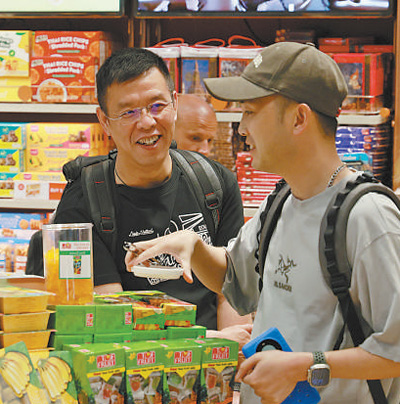 在泰國曼谷素萬那普機場免稅店,兩名中國游客正在購買當?shù)靥厣a(chǎn)品。本報記者 白元琪攝