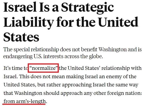 然而,美國《外交政策》雜志刊文分析,以色列如今已成為美國的戰(zhàn)略負擔,現(xiàn)在到了推動美國同以色列關系"正?;?的時候了。美國對待以色列,要像其對待任何其他國家一樣:保持距離。