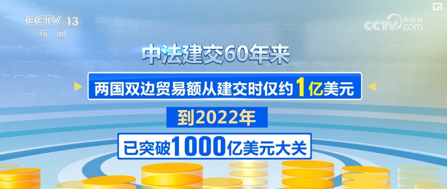 中法建交60年來,兩國(guó)雙邊貿(mào)易額從建交時(shí)僅約1億美元,到2022年已突破1000億美元大關(guān)。如今,法國(guó)是中國(guó)在歐盟內(nèi)第三大貿(mào)易伙伴和第三大實(shí)際投資來源國(guó),中國(guó)則是法國(guó)在亞洲第一大貿(mào)易伙伴。