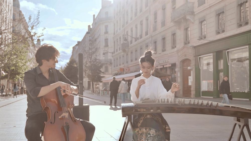 在彭靜旋的視頻中,有一個(gè)在法國尼斯與街頭鋼琴藝術(shù)家的合作作品,被網(wǎng)友親切地形容為“兩琴相悅”“琴箏意切”。