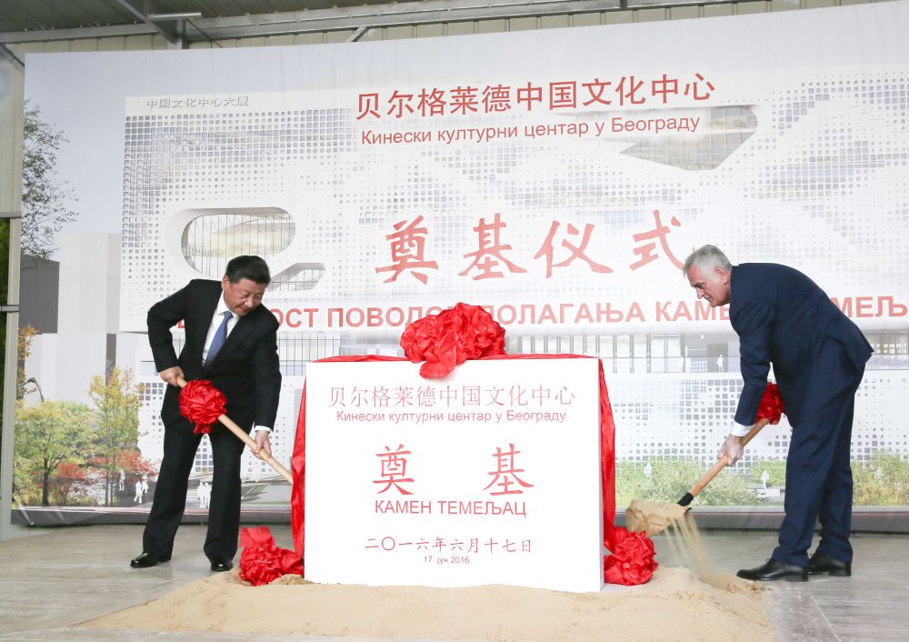2016年6月17日,國家主席習近平與時任塞爾維亞總統(tǒng)尼科利奇在貝爾格萊德共同出席中國文化中心奠基儀式。