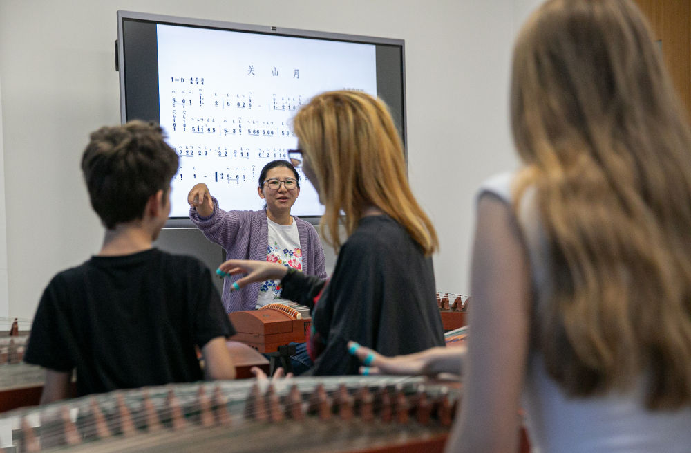 2024年4月29日,在貝爾格萊德中國文化中心,古箏指導老師王宣(后)在教學。