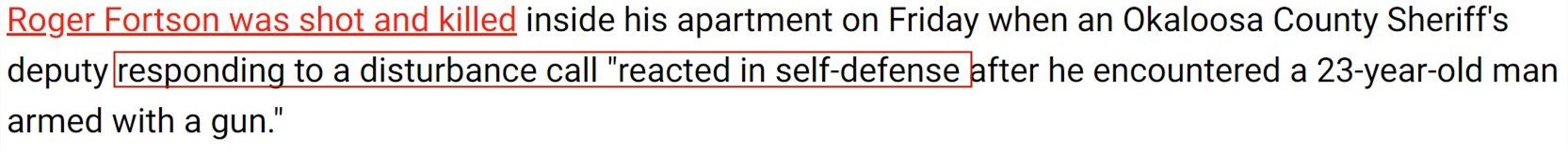 佛羅里達(dá)州奧卡魯沙縣警察局在事后發(fā)表的聲明中稱(chēng),涉事警察在案發(fā)當(dāng)天接到有關(guān)“擾亂公共秩序”的報(bào)警,后來(lái)在看到福特森持槍時(shí)出于“自衛(wèi)”才開(kāi)火。