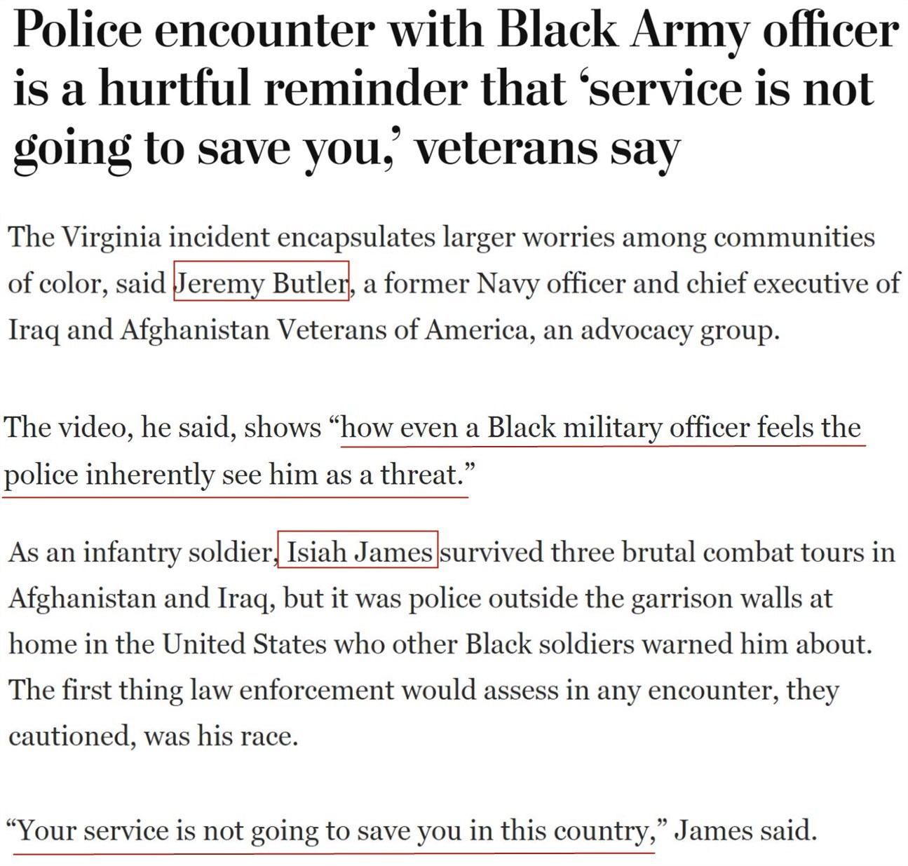 曾在阿富汗和伊拉克的三次殘酷戰(zhàn)斗中幸存下來(lái)的非裔美軍士兵伊塞亞·詹姆斯退役后,曾被其他非裔戰(zhàn)友“友情提醒”:打仗不是最可怕的,真正要小心的是美國(guó)警察,“在這個(gè)國(guó)家,即使在軍中服役也救不了你”。