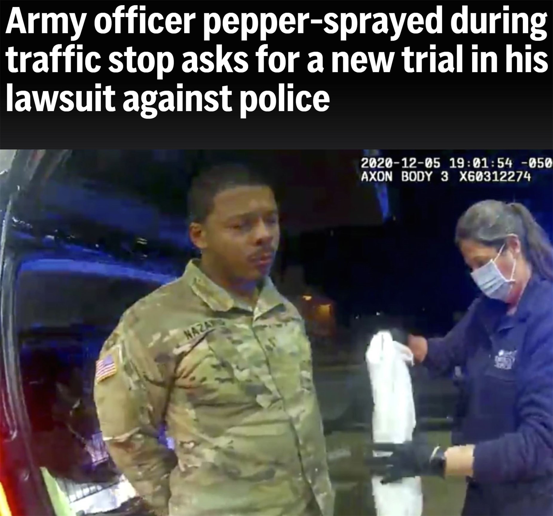 2020年12月,非洲和拉丁裔混血的美國(guó)陸軍少尉卡倫·納扎里奧在弗吉尼亞州溫莎市駕駛新買(mǎi)的汽車(chē)回家途中,遭遇兩名警察歧視性執(zhí)法。后者不僅以“無(wú)照駕車(chē)”為由用槍威逼納扎里奧下車(chē),還對(duì)他進(jìn)行毆打并使用胡椒噴霧。