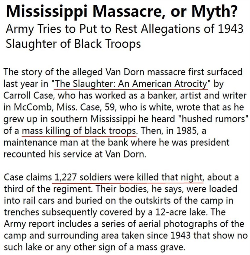 2000年美國(guó)曾出版《屠殺:美國(guó)的殘暴》一書(shū),首次披露了二戰(zhàn)期間美國(guó)白人軍官下令在密西西比州一個(gè)陸軍營(yíng)地血腥屠殺1200多名非裔士兵的歷史黑幕,引起軒然大波。