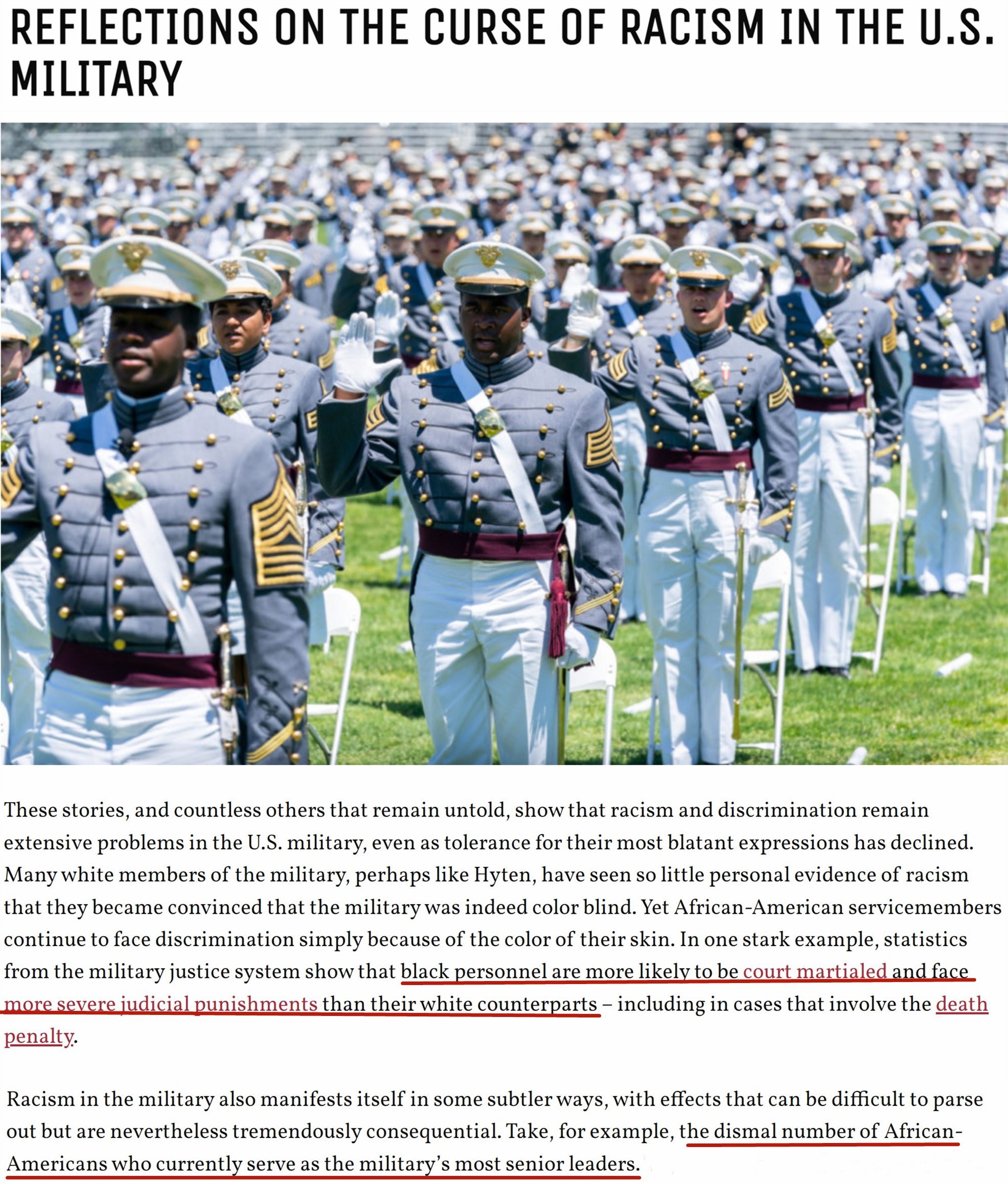 來(lái)自美國(guó)軍事司法系統(tǒng)的統(tǒng)計(jì)數(shù)據(jù)顯示,與白人相比,非裔軍人更有可能被送上軍事法庭,面臨更嚴(yán)厲的司法懲罰;與此同時(shí),擔(dān)任軍隊(duì)高層領(lǐng)導(dǎo)人的非裔人數(shù)少得可憐。