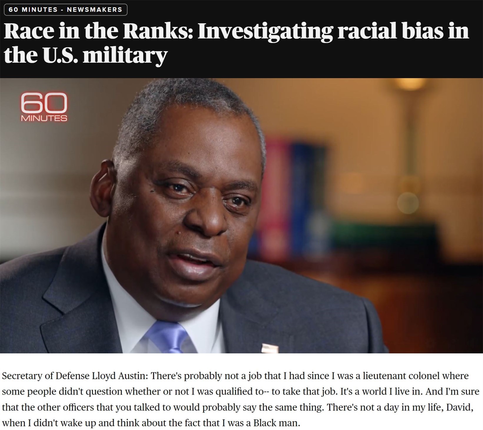 “(非裔)在晉升方面的處境仍無(wú)改觀,總是有人會(huì)因?yàn)槟愕臉用捕鴮?duì)你的任職資格提出疑問(wèn),這就是我生活的世界,而且我非??隙▌e的(非裔)軍官也會(huì)說(shuō)同樣的話。在我生命中的每一天,早晨醒來(lái)都會(huì)思考這個(gè)事實(shí):我是一個(gè)非洲裔?!?/p>