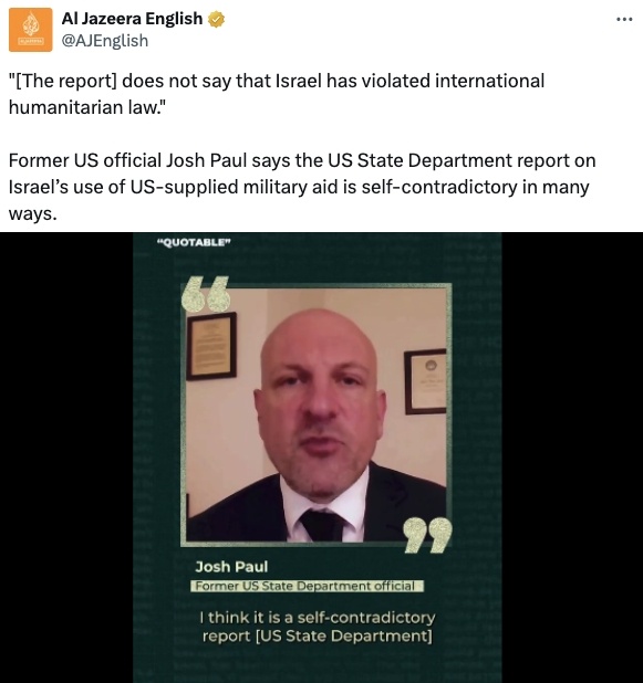 因不滿(mǎn)拜登政府巴以政策而于去年10月辭職的美國(guó)國(guó)務(wù)院政治軍事事務(wù)局前主任喬?!けA_認(rèn)為,這是一份自相矛盾的報(bào)告,沒(méi)有從所確定的事實(shí)中得出合乎邏輯的結(jié)論。