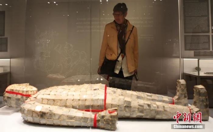 在匈牙利古都塞克什白堡舉行的“不朽的玉甲—中國漢代文物精品展”,共展出百余件玉器、漆器、陶器、青銅器、印章、石刻、錢幣等漢代文物,將漢代政治經(jīng)濟、社會生活、文化藝術(shù)和禮儀信仰逐一呈現(xiàn)。圖為當?shù)貢r間5月7日,一名觀眾駐足細觀徐州博物館鎮(zhèn)館之寶西漢金縷玉衣。中新社記者 德永健 攝