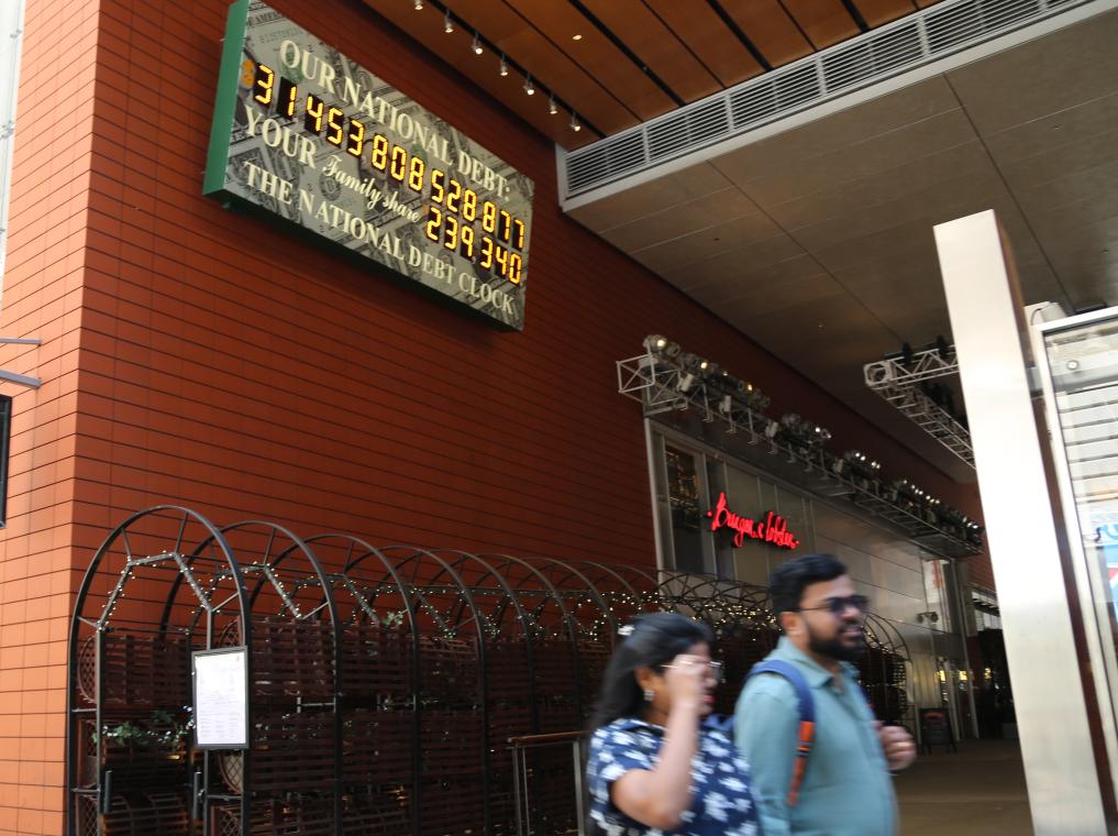 2023年5月29日,人們經(jīng)過(guò)美國(guó)紐約曼哈頓的“國(guó)債鐘”?!皣?guó)債鐘”是一個(gè)大型計(jì)數(shù)器,它實(shí)時(shí)更新美國(guó)的公共債務(wù)總額,并顯示出每個(gè)美國(guó)家庭所要負(fù)擔(dān)的數(shù)額。新華社記者劉亞南攝