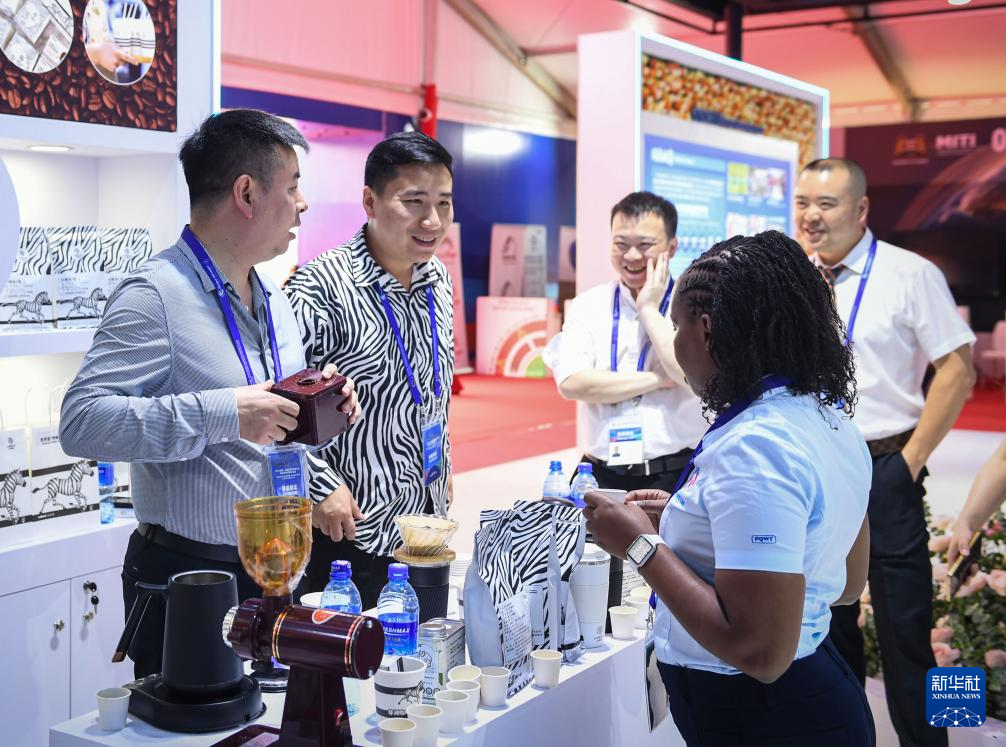 2024年5月9日,參展商在肯尼亞首都內(nèi)羅畢舉辦的中非經(jīng)貿(mào)博覽會(huì)走進(jìn)非洲巡展上推銷咖啡產(chǎn)品。新華社記者 李亞輝 攝