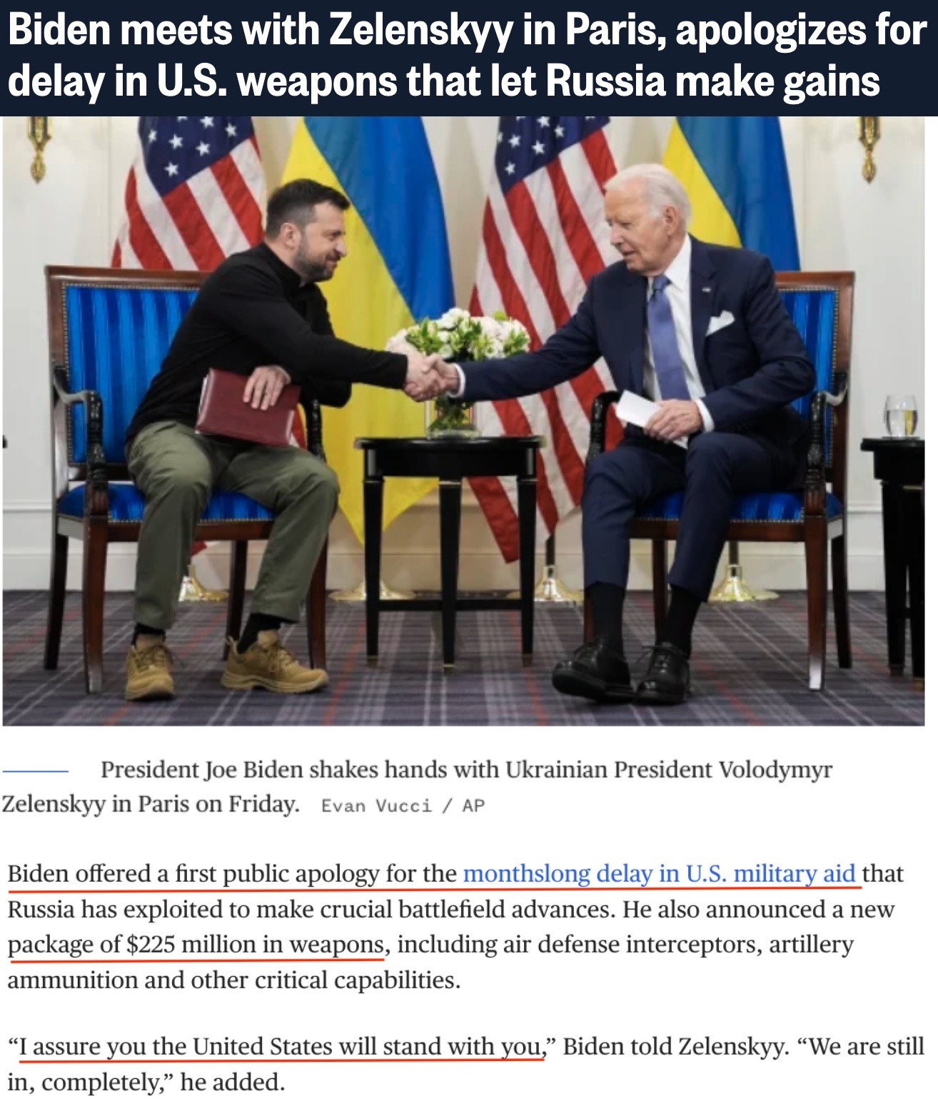 在巴黎會(huì)見(jiàn)烏克蘭總統(tǒng)澤連斯基時(shí),拜登首次就美國(guó)國(guó)會(huì)未能更早通過(guò)對(duì)烏新援助法案“道歉”,并宣布將再向?yàn)蹩颂m提供2.25億美元援助。
