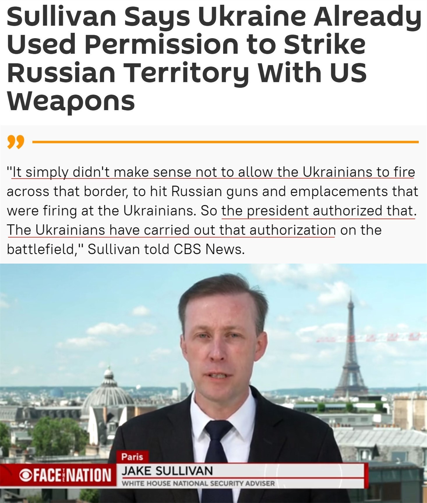 △俄羅斯衛(wèi)星通訊社:美國(guó)總統(tǒng)國(guó)家安全事務(wù)助理沙利文9日在接受美媒采訪時(shí)證實(shí),烏軍已經(jīng)使用美國(guó)提供的武器打擊俄羅斯本土目標(biāo)。