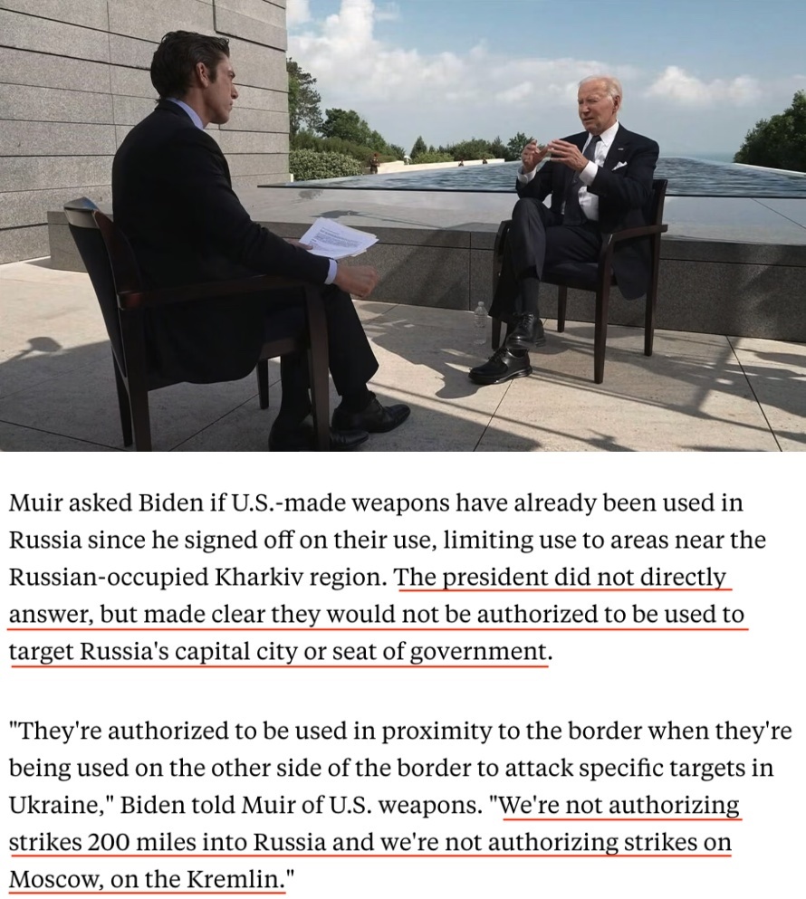 “它們(這些武器)被授權(quán)在(烏俄)邊境附近使用……我們沒(méi)有授權(quán)(烏克蘭)向俄羅斯境內(nèi)200英里(約合320公里)的地方發(fā)動(dòng)襲擊,也沒(méi)有授權(quán)對(duì)莫斯科、克里姆林宮進(jìn)行打擊?!?/p>