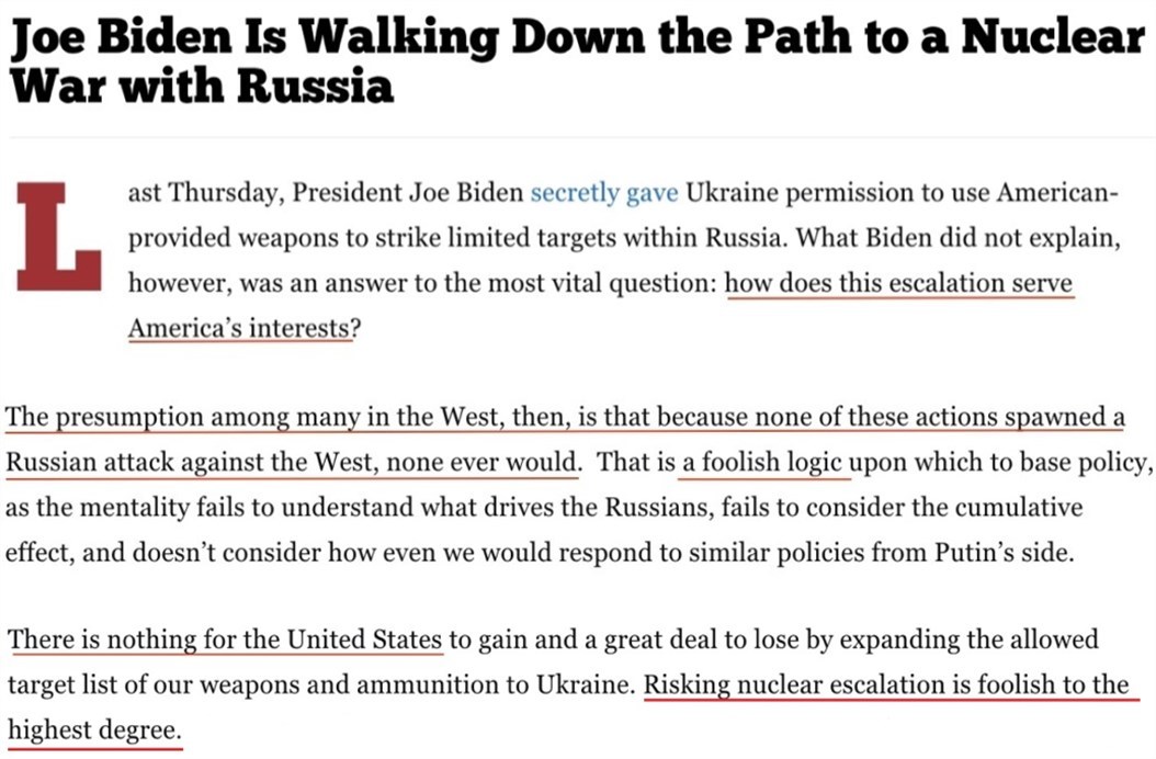 美國(guó)《國(guó)家利益》雜志在題為《拜登正走上與俄羅斯爆發(fā)核戰(zhàn)爭(zhēng)之路》的文章中指出,拜登在允許烏克蘭使用美國(guó)武器打擊俄本土目標(biāo)時(shí)沒(méi)有解釋一個(gè)最關(guān)鍵的問(wèn)題:這種行為升級(jí)是否符合美國(guó)的利益?
