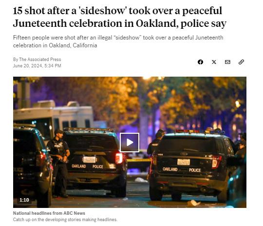 據(jù)報道,奧克蘭警方表示,槍擊事件發(fā)生在該市舉行的一場未經(jīng)批準的六月節(jié)慶?;顒悠陂g。有人踩上一輛汽車引擎蓋引發(fā)斗毆,進而發(fā)生槍擊事件。