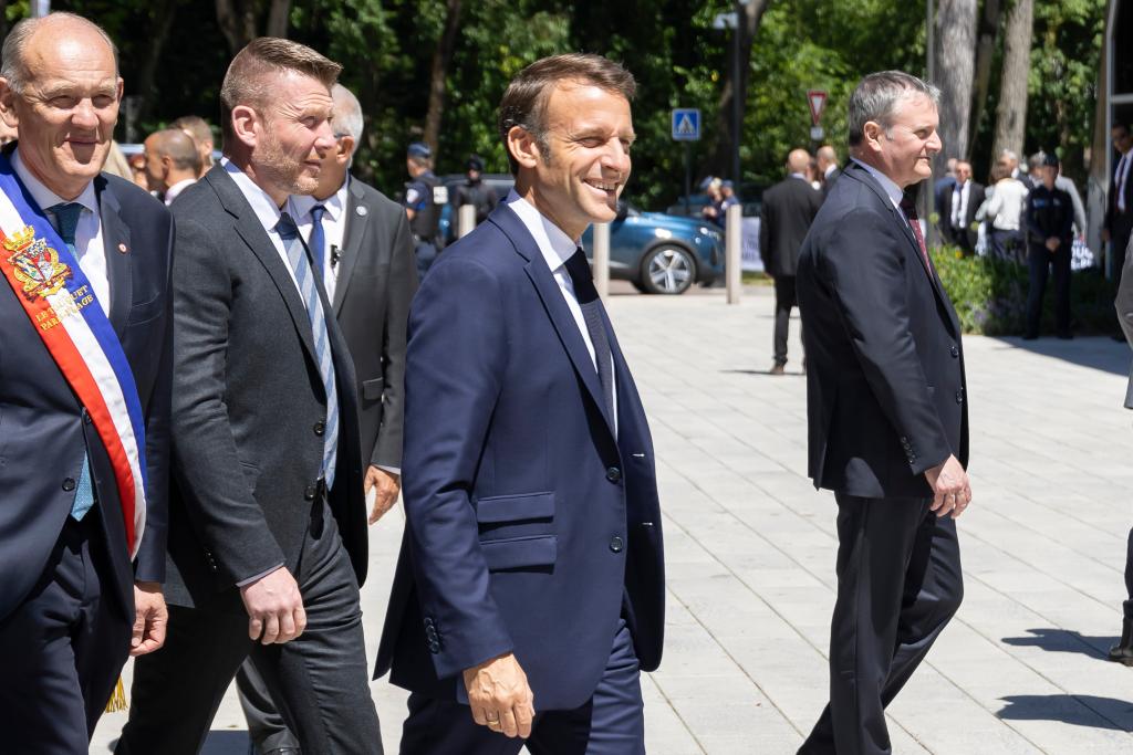 6月9日,在法國勒圖凱市一處投票站外,法國總統(tǒng)馬克龍(右二)在參加歐洲議會選舉投票前與民眾交流。新華社發(fā)(弗蘭克·博阿姆攝)