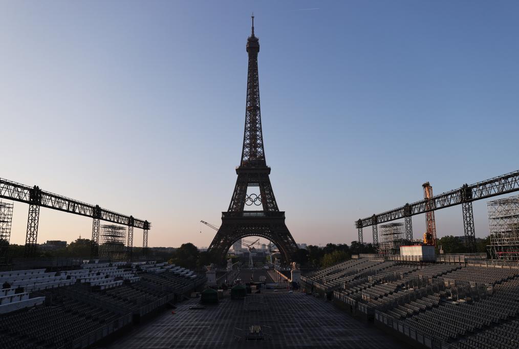 這是6月7日清晨在法國巴黎拍攝的懸掛奧運五環(huán)標志的埃菲爾鐵塔以及正在搭建看臺的特羅卡德羅廣場,巴黎奧運會開幕式的慶祝活動將在這里舉行。 新華社記者高靜攝