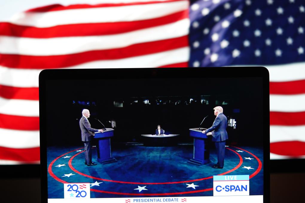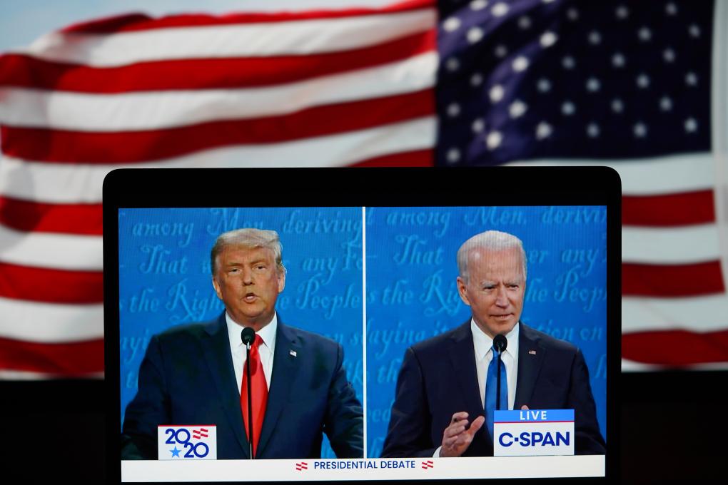 2020年10月22日在美國(guó)弗吉尼亞州阿靈頓拍攝的視頻畫面顯示,時(shí)任美國(guó)總統(tǒng)特朗普(右)與時(shí)任民主黨總統(tǒng)候選人拜登(左)在田納西州納什維爾市參加最后一場(chǎng)總統(tǒng)候選人電視辯論。新華社記者劉杰攝