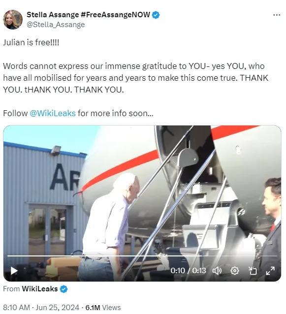 當(dāng)?shù)貢r(shí)間25日,朱利安·阿桑奇的妻子斯特拉在社交媒體上激動(dòng)地寫(xiě)道,“言語(yǔ)無(wú)法表達(dá)我們對(duì)你們的感激之情——是的,就是你們,多年來(lái),你們一直努力讓這一切成為現(xiàn)實(shí)。謝謝你們。謝謝你們,謝謝你們。”