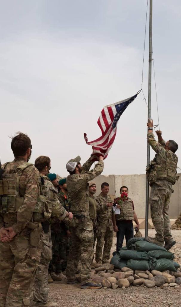 2021年5月2日,美軍士兵在阿富汗赫爾曼德省一處軍事基地降下美國(guó)國(guó)旗。當(dāng)日,美軍向阿富汗國(guó)民軍移交這處軍事基地。美國(guó)和北約軍隊(duì)5月1日起正式開始撤離阿富汗,計(jì)劃在9月11日前撤完。新華社發(fā)(阿富汗國(guó)防部供圖)