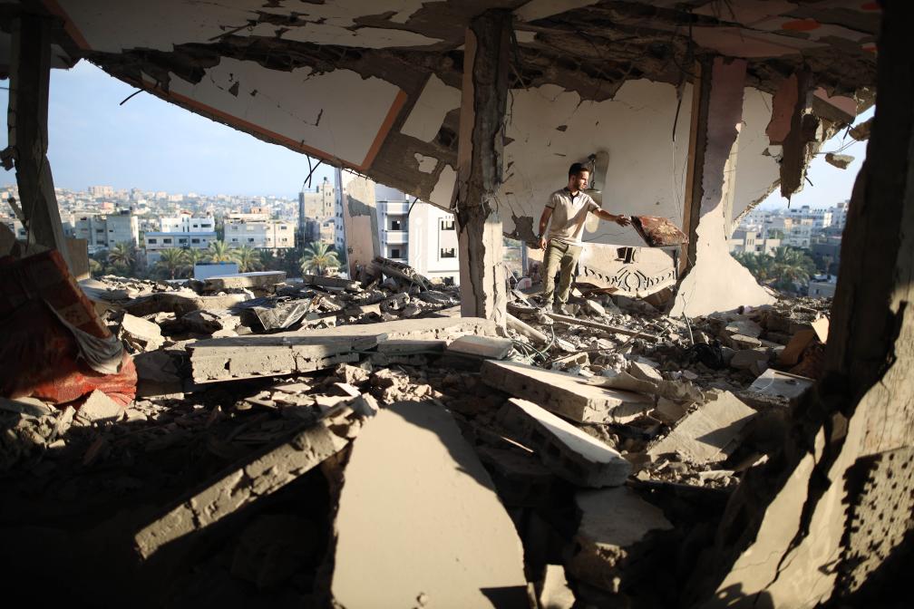 7月18日,在加沙地帶中部努賽賴特難民營,一名男子查看遭到以軍襲擊的建筑廢墟。新華社發(fā)(馬爾萬·達烏德攝)