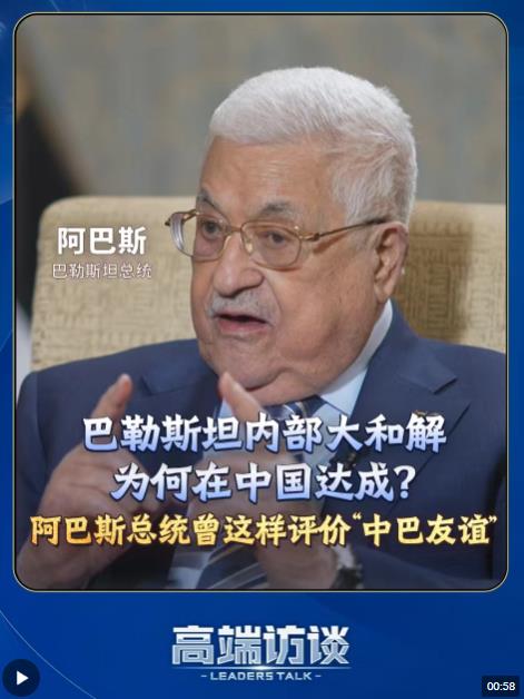 7月23日,巴勒斯坦各派在北京簽署了《關(guān)于結(jié)束分裂加強(qiáng)巴勒斯坦民族團(tuán)結(jié)的北京宣言》。巴勒斯坦內(nèi)部大和解,為何是在中國?巴勒斯坦總統(tǒng)阿巴斯接受總臺(tái)《高端訪談》專訪時(shí)曾這樣評(píng)價(jià)中巴友誼,來聽聽他怎么說。
