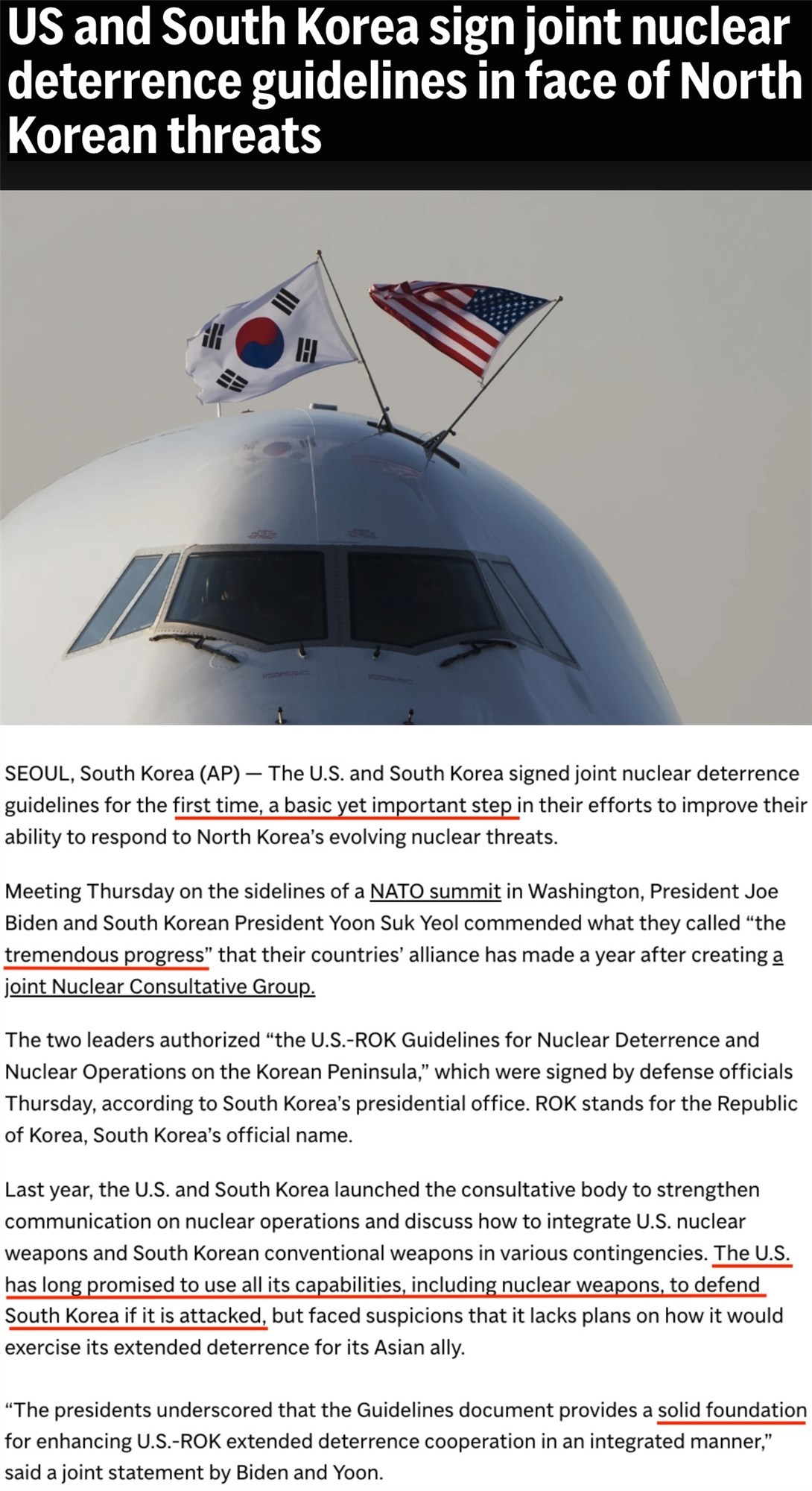 本月11日,在北約華盛頓峰會間隙,美韓兩國國防部官員簽署《美韓關于朝鮮半島核威懾與核作戰(zhàn)的指導方針》。這也是兩國首次簽署此類文件,被認為是“兩國努力提高應對朝鮮核威脅能力的基本且重要的一步”。