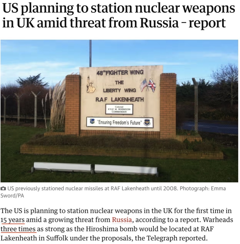 △英國《衛(wèi)報》:英國薩??丝だ舷K蓟始铱哲娀匦略O施的采購合同證實,美國打算在該空軍基地部署三倍于轟炸廣島原子彈威力的核彈頭。