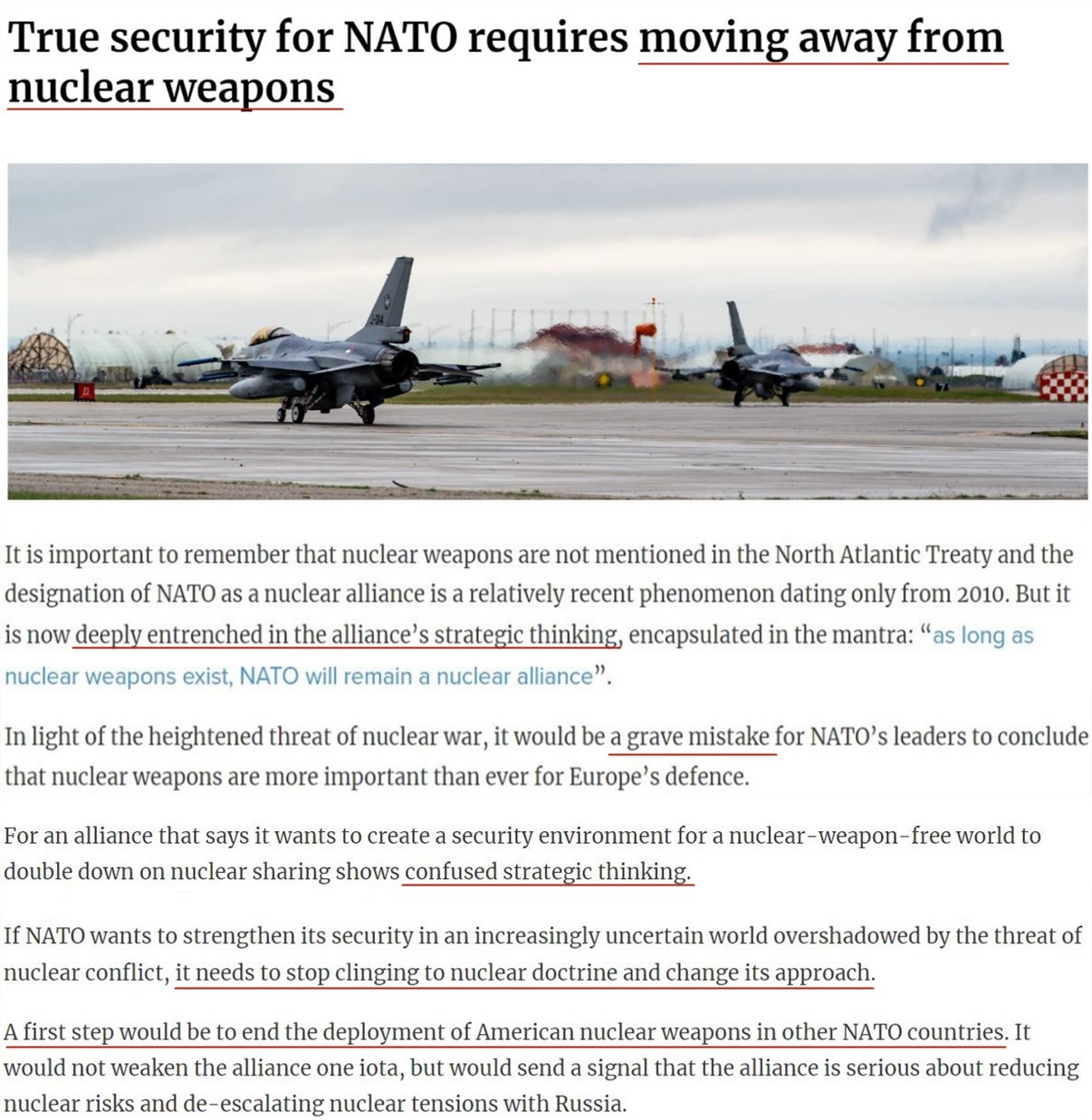 文章指出,《北大西洋公約》中并沒有提到核武器,但如今,它已深深根植于北約的戰(zhàn)略思想之中。鑒于核戰(zhàn)爭危險的加劇,北約領導人如果斷定核武器對歐洲防務比以往任何時候都重要,那將是一個嚴重的錯誤。