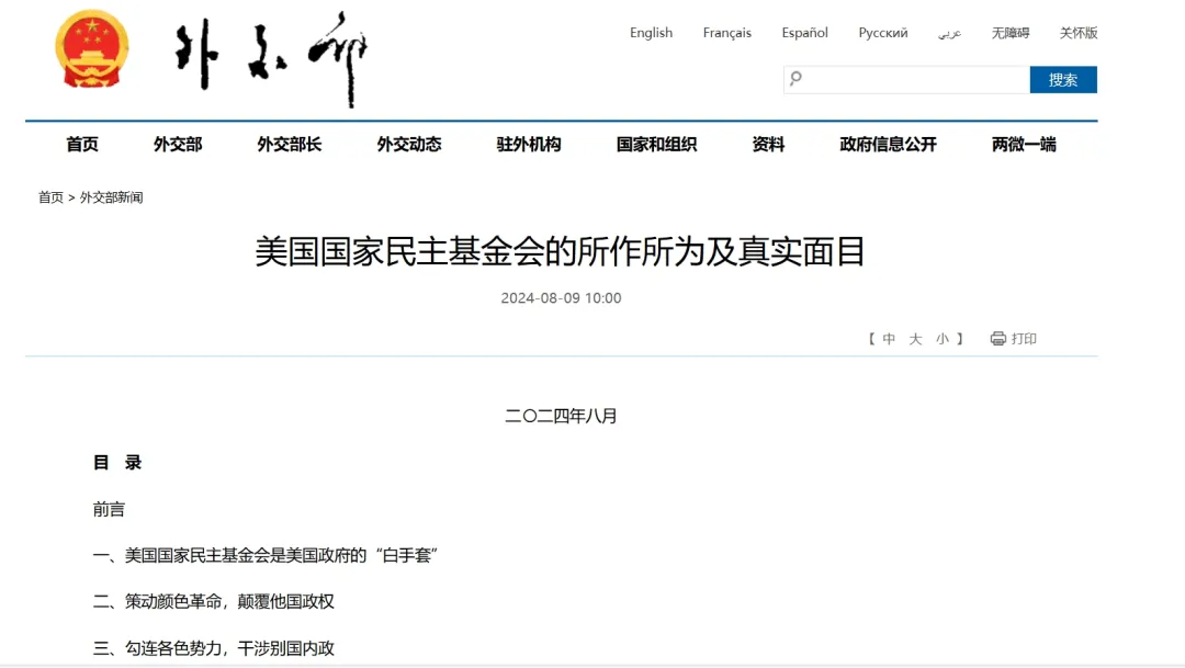 8月9日,中國外交部網(wǎng)站發(fā)布一份重磅報告:《美國國家民主基金會的所作所為及真實(shí)面目》。