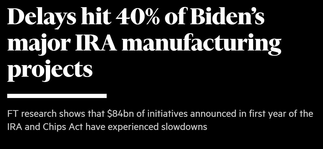 然而,《金融時(shí)報(bào)》的調(diào)查發(fā)現(xiàn),與上述法案相關(guān)的過億美元大項(xiàng)目共114個(gè),總投資2279億美元,但其中總投資約840億美元的項(xiàng)目進(jìn)度滯后兩個(gè)月至數(shù)年,甚至無限停擺。