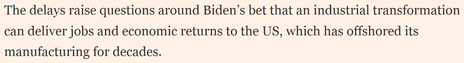按照《金融時(shí)報(bào)》的說法,項(xiàng)目遲滯令輿論質(zhì)疑拜登政府所篤定的工業(yè)轉(zhuǎn)型有望為美國(guó)帶來就業(yè)和經(jīng)濟(jì)回報(bào)的說法。