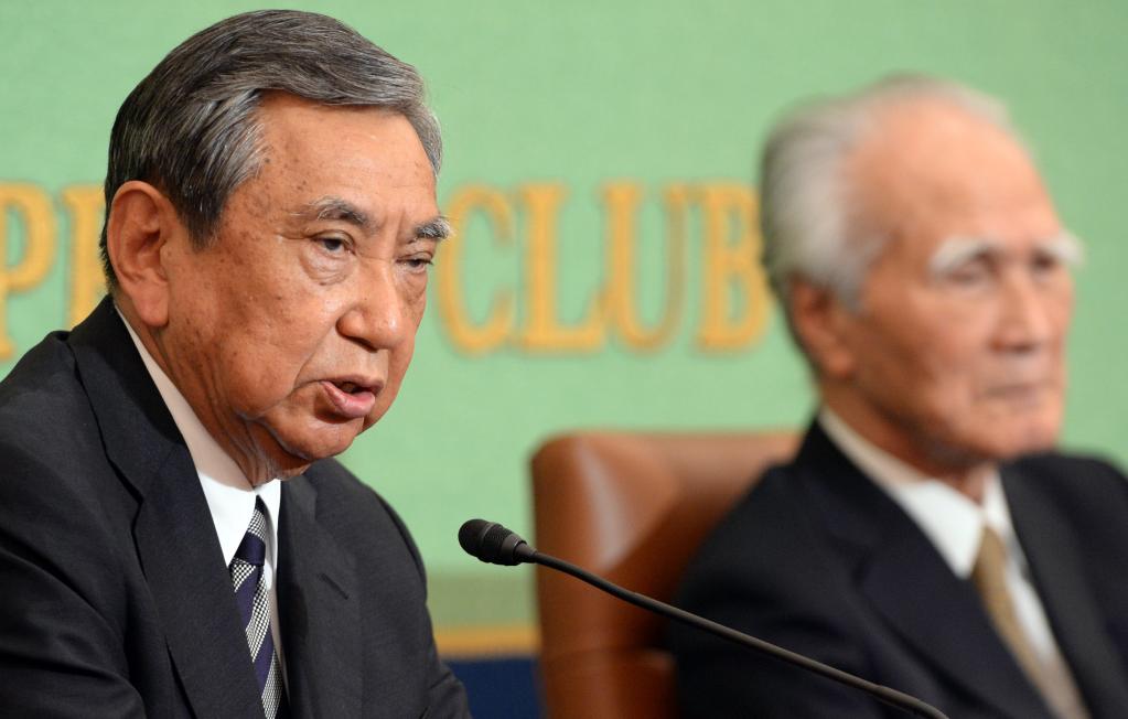 2015年6月9日,在日本東京,日本前內(nèi)閣官房長(zhǎng)官河野洋平(左)發(fā)表講話。當(dāng)日,河野洋平和前首相村山富市在日本記者俱樂部舉行對(duì)談,重申承認(rèn)殖民侵略歷史事實(shí)、堅(jiān)持和平憲法對(duì)日本的重要意義。新華社記者馬平攝