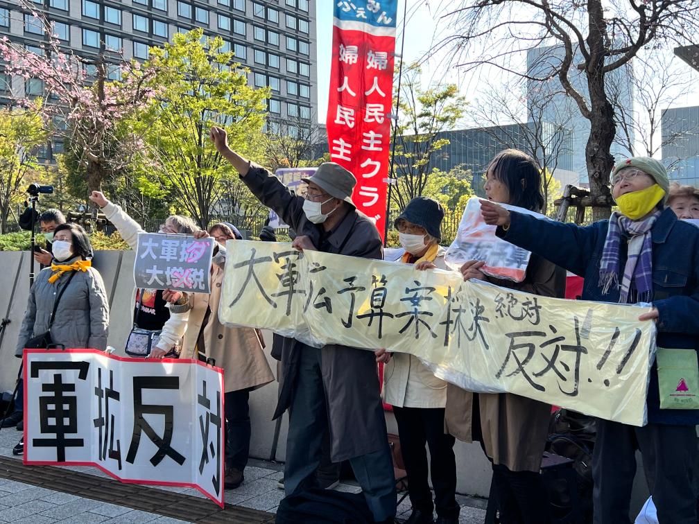 2023年3月28日,在日本東京,民眾在參議院議員會(huì)館前舉行抗議活動(dòng),反對(duì)參議院當(dāng)天通過(guò)“軍備擴(kuò)張預(yù)算”案。新華社記者姜俏梅攝