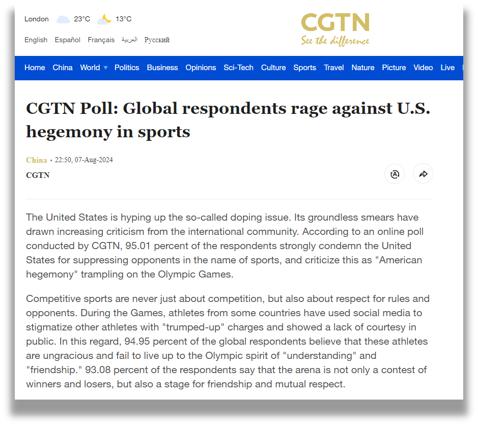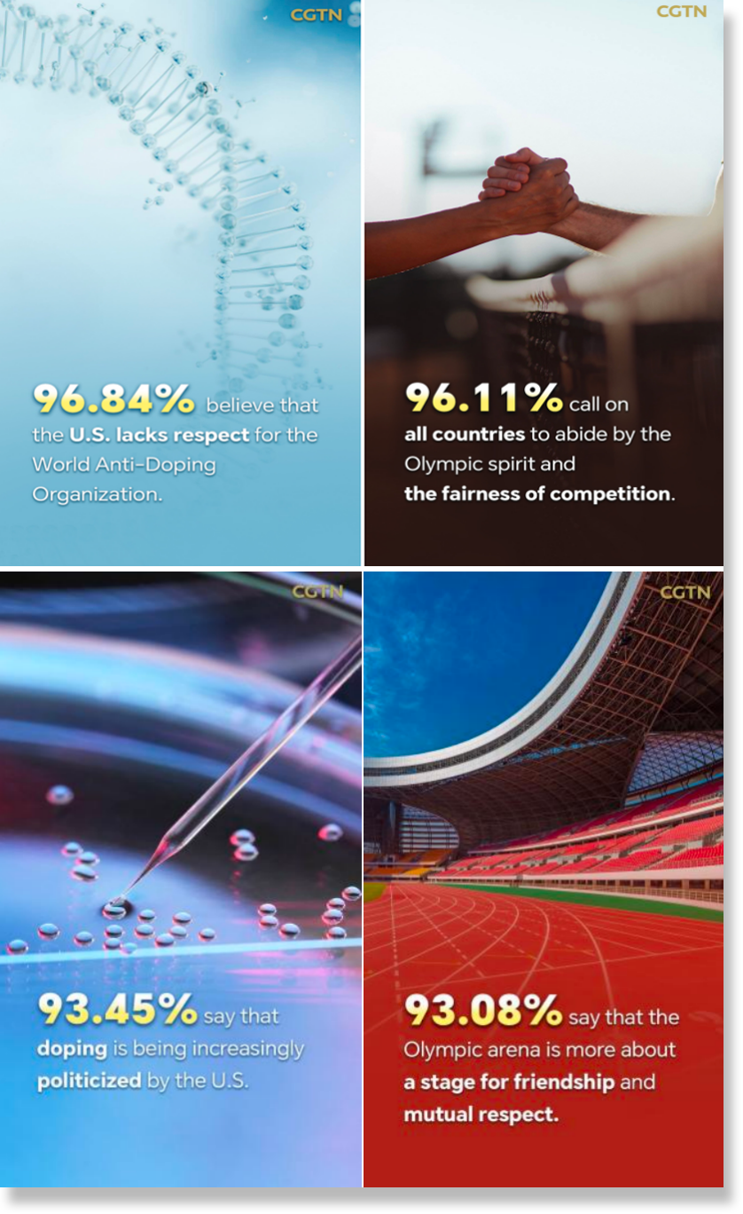 總臺CGTN先后兩次發(fā)起全球民調(diào),調(diào)查顯示,96.84%的受訪者認(rèn)為美方缺乏對世界反興奮劑機(jī)構(gòu)的尊重,是在挑戰(zhàn)公平和權(quán)威;96.25%的受訪者痛批美國在興奮劑監(jiān)管方面“雙重標(biāo)準(zhǔn)”;93.45%的受訪者表示,興奮劑問題日益被美國政治化和工具化;95.57%的受訪者認(rèn)為美國反興奮劑機(jī)構(gòu)或存包庇行為,為涉興奮劑的美國運動員開脫……