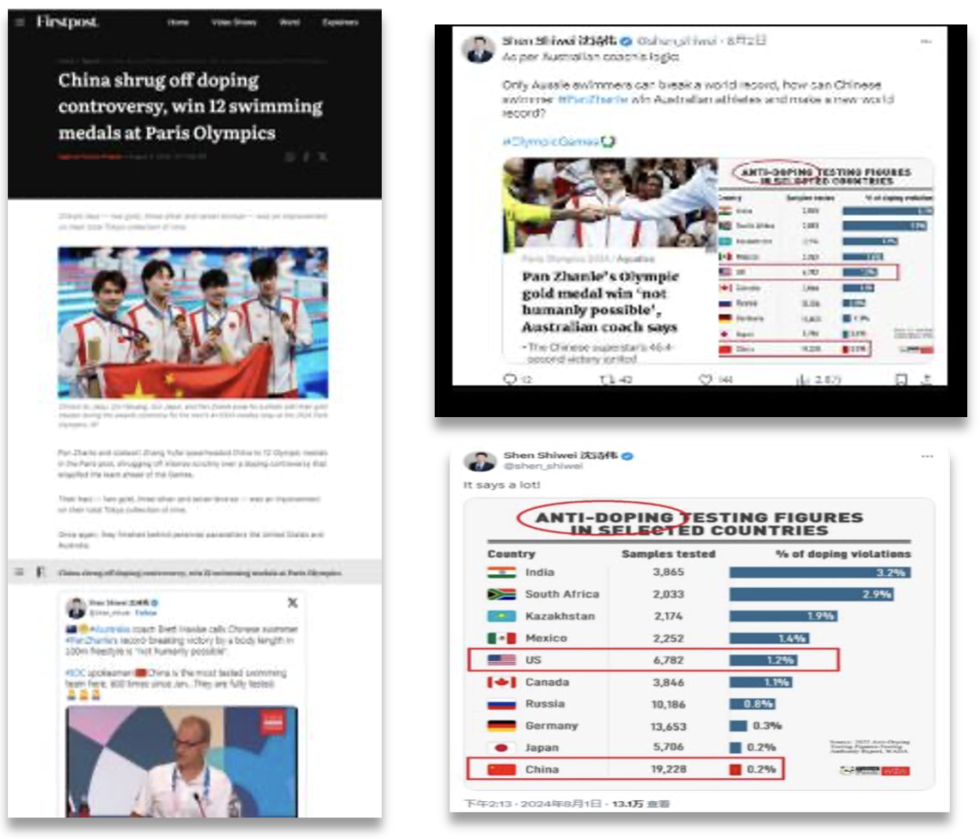 除了用及時的新聞消息擺出事實,總臺各評論欄目節(jié)目鏗鏘發(fā)聲,深度起底美炒作興奮劑問題的真實動機(jī)?!皣H銳評”發(fā)布評論文章《美方必須就大規(guī)模使用興奮劑問題給世界一個交代》,強(qiáng)調(diào)奧林匹克精神不能被“美式霸權(quán)”玷污,反興奮劑工作不應(yīng)淪為抹黑和打壓他國的工具;CGTN評論專欄《對話》《視點》《今日》等迅速反應(yīng),邀請多位中外業(yè)內(nèi)人士深度訪談,犀利剖析美國惡意污蔑中國運動員背后的險惡用心;玉淵譚天譚主檢索分析美西方媒體今年以來的相關(guān)報道數(shù)據(jù),給國際檢測機(jī)構(gòu)(ITA)發(fā)送郵件獲取獨家回應(yīng),并且提取過去二十余年美國濫用興奮劑事件中的相關(guān)信息,還原美西方抹黑中國游泳隊的傳播鏈。