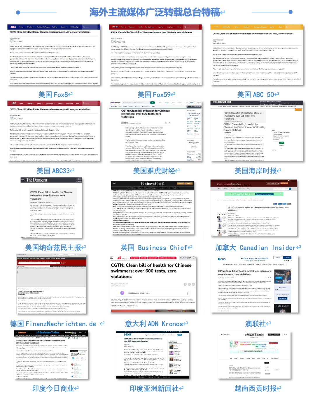 針對美西方借興奮劑抹黑中國這一議題,總臺多語種對外傳播平臺與海外總站、國際視頻通訊社緊密聯(lián)動,通過全球媒體伙伴網(wǎng)絡(luò),不斷放大正義的音量。僅在3天內(nèi),就有1800余家海外主流媒體積極轉(zhuǎn)載總臺多語種特稿,創(chuàng)下短時傳播新紀(jì)錄,引發(fā)國際輿論高度關(guān)注和強(qiáng)烈反響。