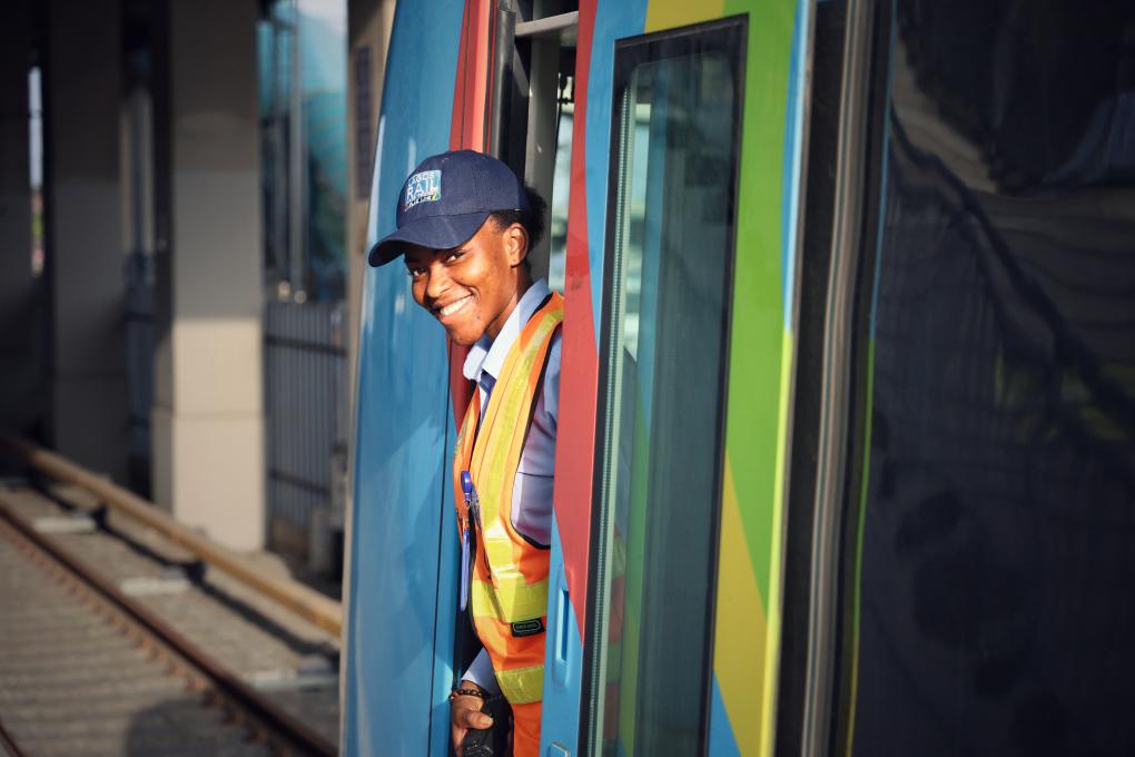6月12日,在尼日利亞拉各斯,拉各斯輕軌藍(lán)線項(xiàng)目動車組列車司機(jī)組長伊莎貝拉·亞當(dāng)斯·伊斯拉埃爾與列車合影。新華社發(fā),中土集團(tuán)尼日利亞有限公司供圖