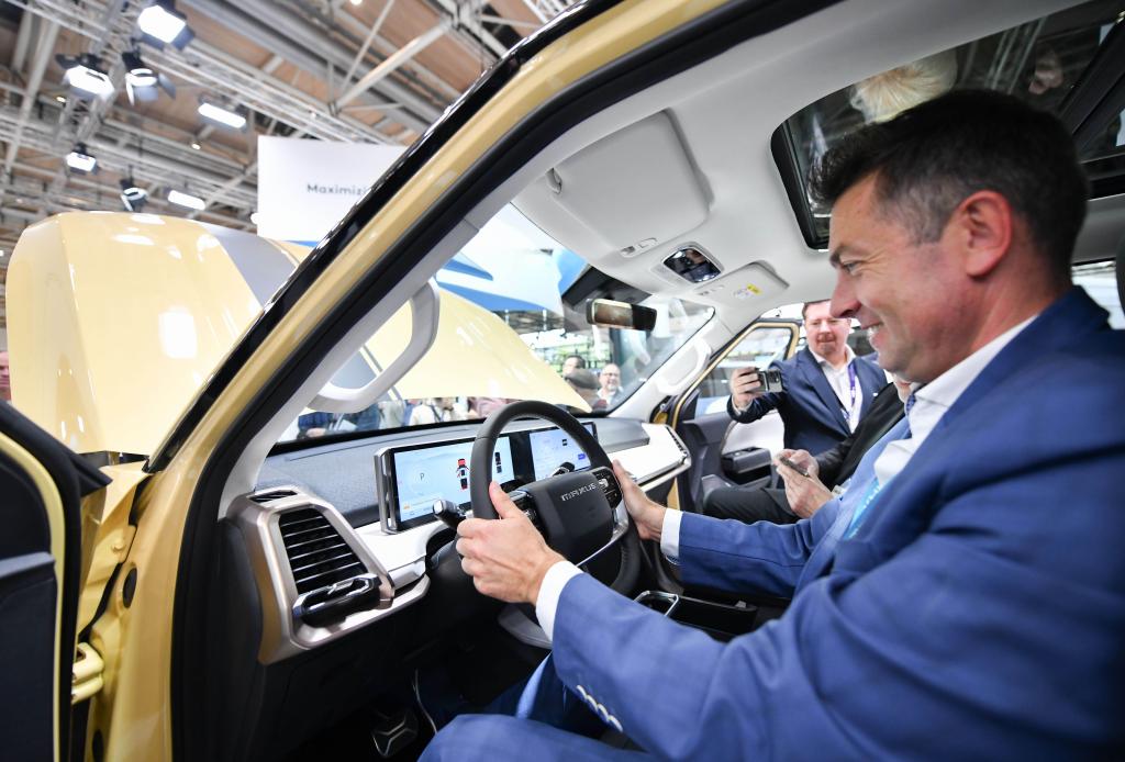 9月16日,在德國(guó)漢諾威國(guó)際交通運(yùn)輸博覽會(huì)媒體預(yù)展上,一名男子體驗(yàn)上汽大通eTerron 9純電皮卡車。新華社記者任鵬飛攝