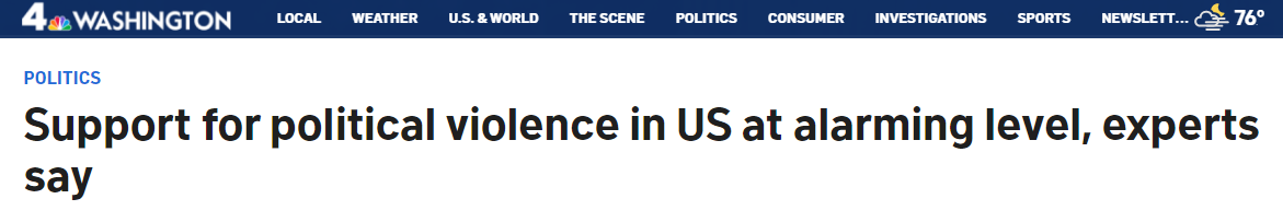另外,美國(guó)國(guó)家廣播公司華盛頓地方頻道(NBC Washington)日前報(bào)道稱(chēng),盡管美國(guó)支持政治暴力的人與去年相比略有減少,但暴力支持者現(xiàn)在更傾向使用槍支來(lái)實(shí)現(xiàn)他們的目的。數(shù)月來(lái),專(zhuān)家們始終表示,美國(guó)對(duì)出于政治動(dòng)機(jī)的暴力的支持度達(dá)到了令人十分擔(dān)憂的水平。