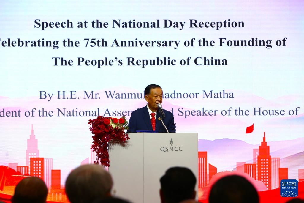 9月24日,在泰國曼谷,泰國國會主席兼下議長萬·穆罕默德·努爾·瑪他在中國駐泰國大使館國慶75周年招待會上致辭。新華社記者 孫瑋彤 攝